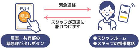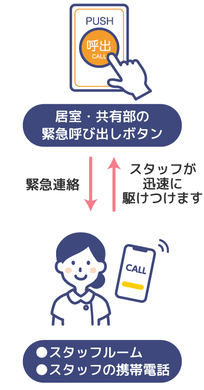 各居室や施設の共用部分に設置された緊急呼び出しボタンにより、日中はもちろん、深夜も専門の介護スタッフが迅速に対応いたします。